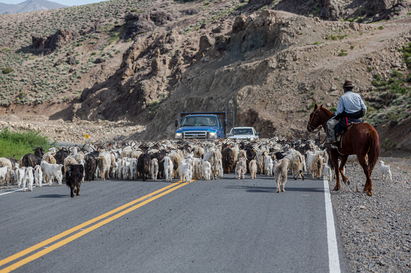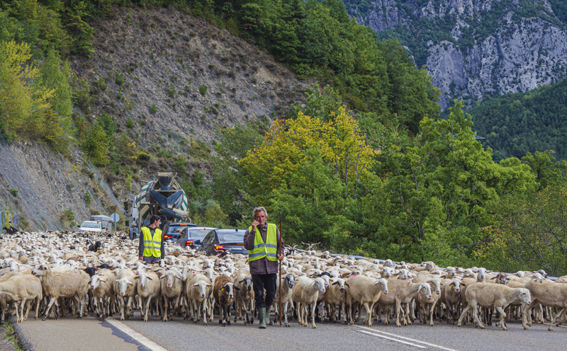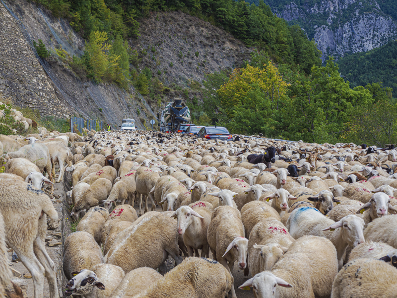Sería muy burdo admitir que fue tal mi deseo de encontrarme con crianceros en las rutas del norte de España, que este casual encuentro fue el resultado de mi profunda aspiración. No quiero ser burdo, fue casualidad, mera suerte. Los sapiens podemos hacer mucho, pero es difícil de creer que la mente pueda organizar a una inmensa cantidad de animales en torno a sus crianceros y colocarlos en una ruta en la que justo pasemos nosotros para sacarle fotos. ¿Quién podría creer semejante disparate? Tampoco vamos a decir que el ayuntamiento de Jaca me organizó esta bienvenida sabiendo que soy un admirador de los trashumantes, sencillamente porque no les avisé que venía… Fue una celebrada y merecida casualidad que aproveché para hacer lo que me gusta. Y la explicación es que acá en España ya comenzó el otoño, de manera que es muy factible que muchos crianceros españoles bajen de las altas montañas de la misma manera que lo hacen en el norte neuquino, solo que en Argentina es al revés, ahora, en el comienzo de la primavera, empiezan a subir a las altas cumbres con sus animales recién paridos.